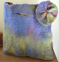I used a plastic grocery bag as a resist for this project. I had left over wool from my scarf project so I made a bag to match. I hand sewed the flower from a scrap piece of felt I made at the same time. This reminds me of a watercolor everytime I look at it.